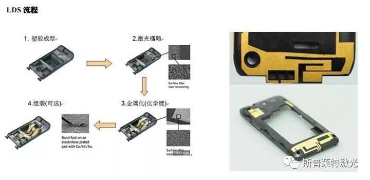 目前LDS一大应用在智能手机终端天线上,称为LDS天线。普通的手机天线都被安装在手机的主板上。而LDS天线技术就是激光直接成型技术(Laser-Direct-structuring),利用计算机按照导电图形的轨迹控制激光的运动,将激光投照到模塑成型的三维塑料器件上,在几秒钟的时间内,活化出电路图案。这样一种技术,可以直接将天线镭射在手机外壳上,满足手机轻薄化空间小的设计需求。