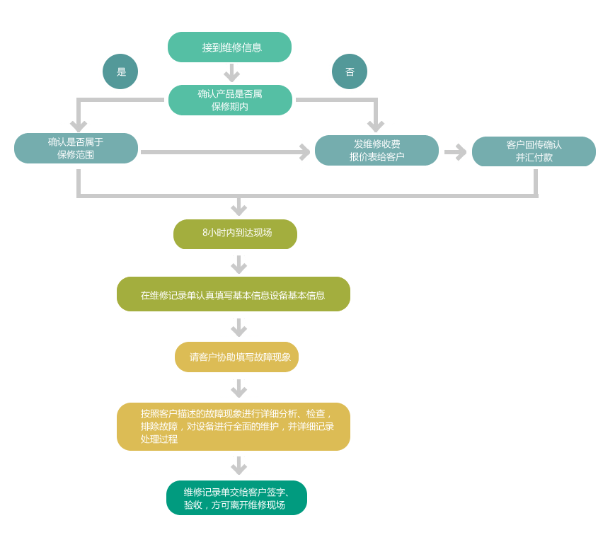 4., after-sales service response time 8 hours, received the user repair phone, the Engineer within 24 hours of a clear answer or arrive at the device site (within 300 km limit). Failure is not ruled out, maintenance personnel are not evacuated;