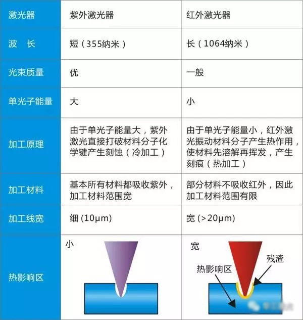 通过对比可以看出:紫外激光聚焦光斑极小,且加工热影响区很小,特别适合超精细打标、切割等应用,是对加工效果有更高要求的客户的首选方式。