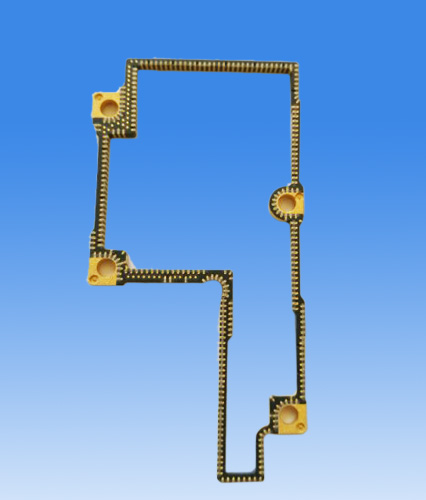 以上电路模组去掉上盖电路后,可以看见周边一圈,这圈围堰上有很多金锡球(焊接点),每个锡球下是金属导电针,构成了信号转接端子。一共有百点以上。周边金黄色的部分是起到电磁屏蔽作用的镀金层。
